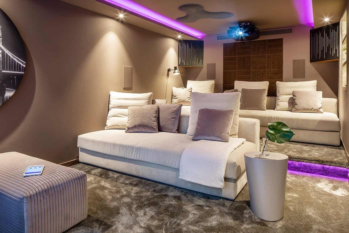 In addition, this cinema room features a Sony 4k projector and an acoustically transparent screen. The front speakers go behind it, so that the whole space is visually perfect.